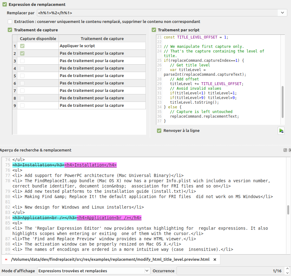 One of the most powerfull feature of Find & Replace It! is its ability to dynamically transform the texts to be replaced. This involves mixing all the classical possibilities of regular expressions with JavaScript programming. Even though it is possible to look for very complex patterns with regular expressions, a simple replacement by a static text is often insufficient. The scripting feature gives us all the power of JavaScript to format whatever we need while the regular expression simply tells us where to apply the script.